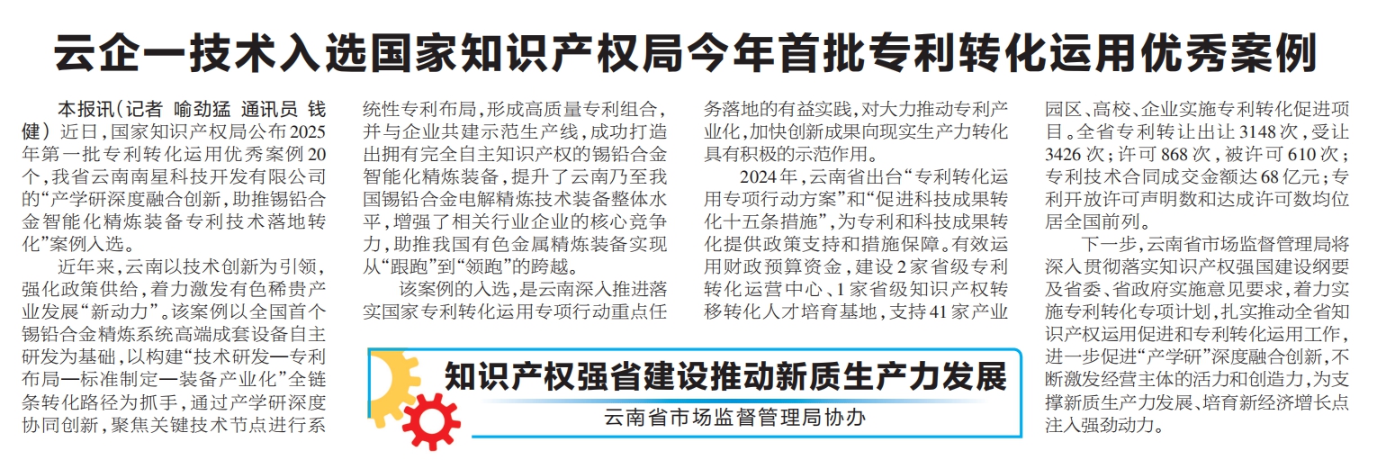 本報訊(記者 喻勁猛 通訊員 錢健) 近日,國家知識產(chǎn)權(quán)局公布 2025 年第一批專利轉(zhuǎn)化運用優(yōu)秀案例 20 個,我省云南南星科技開發(fā)有限公司的“產(chǎn)學(xué)研深度融合創(chuàng)新,助推錫鉛合金智能化精煉裝備專利技術(shù)落地轉(zhuǎn)化”案例入選。